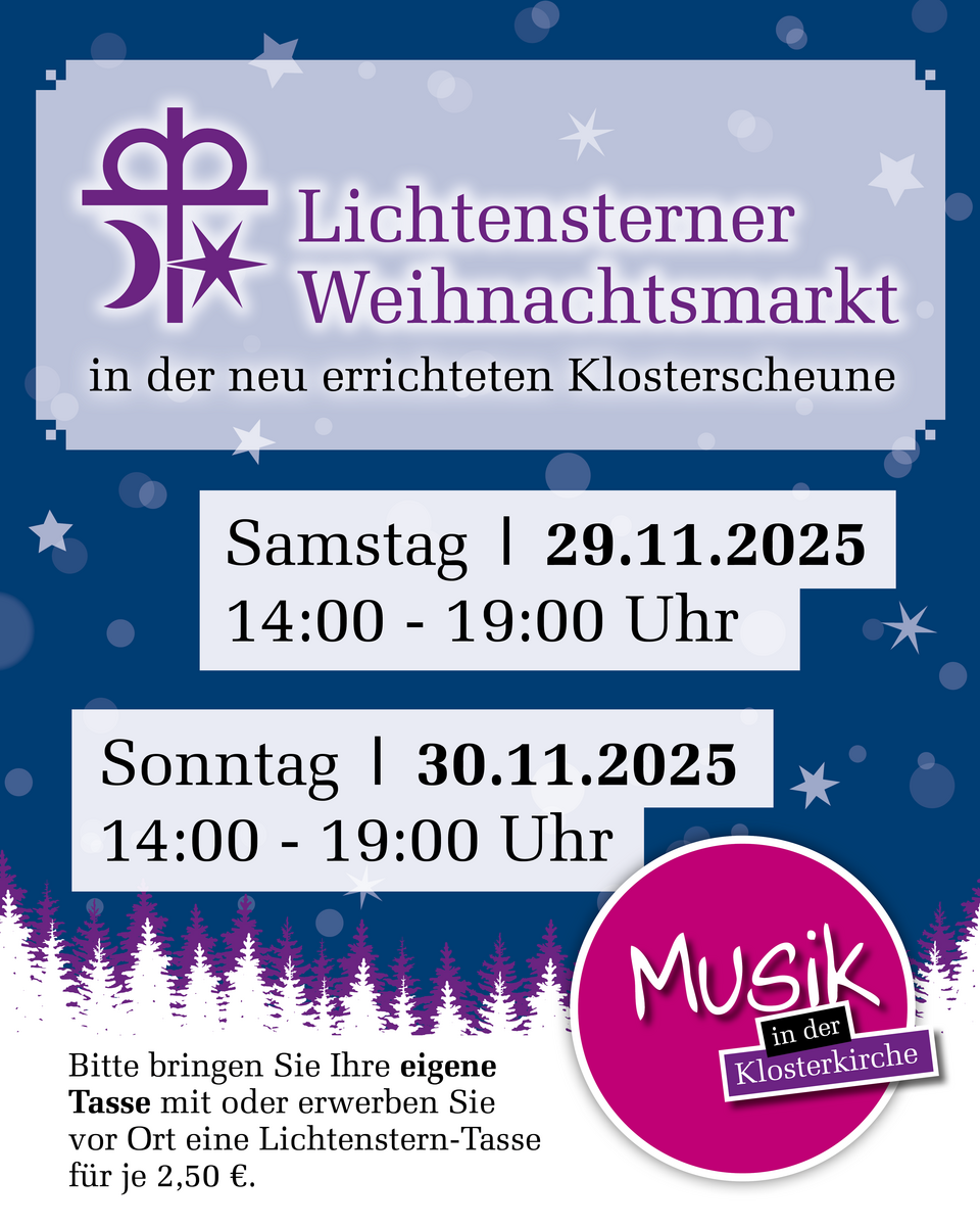 Am ersten Adventswochenende wird das ehemalige Klostergelände der Evangelischen Stiftung Lichtenstern wieder zum stimmungsvollen Schauplatz des traditionellen Weihnachtsmarktes – wie immer mit ganz viel Herz, kulinarischen Highlights und Musik! Zum ersten Mal seit langem findet der Weihnachtsmarkt in der neu errichteten Klosterscheune statt – überdacht, warm und wettergeschützt.